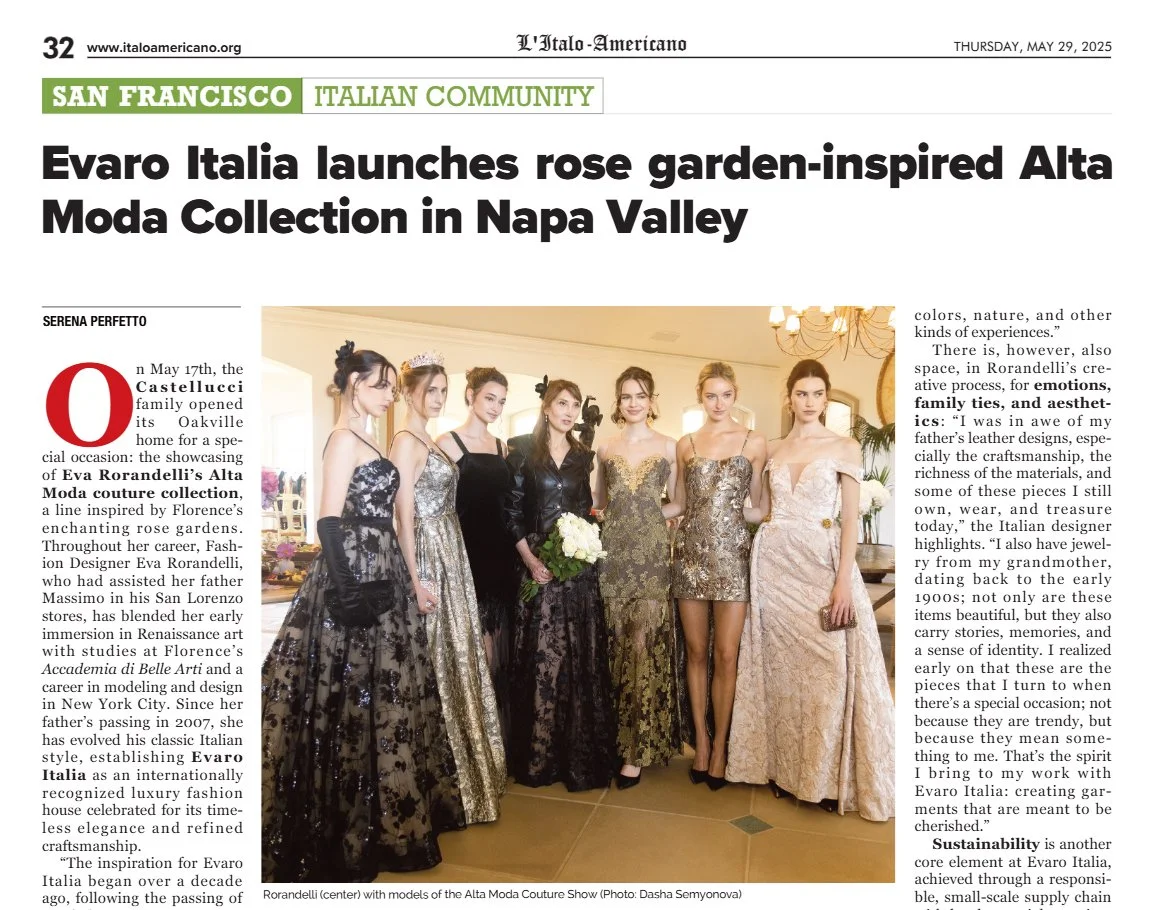 L’Italo-Americano recently featured Evaro Italia’s Spring Alta Moda show—a celebration of Florentine elegance, artisanal heritage, and the enduring beauty of couture. Set amid the rolling vineyards of Napa Valley, the article traces founder Eva Rorandelli’s journey from her Florentine roots to the creation of a modern Italian luxury house with international reach.
